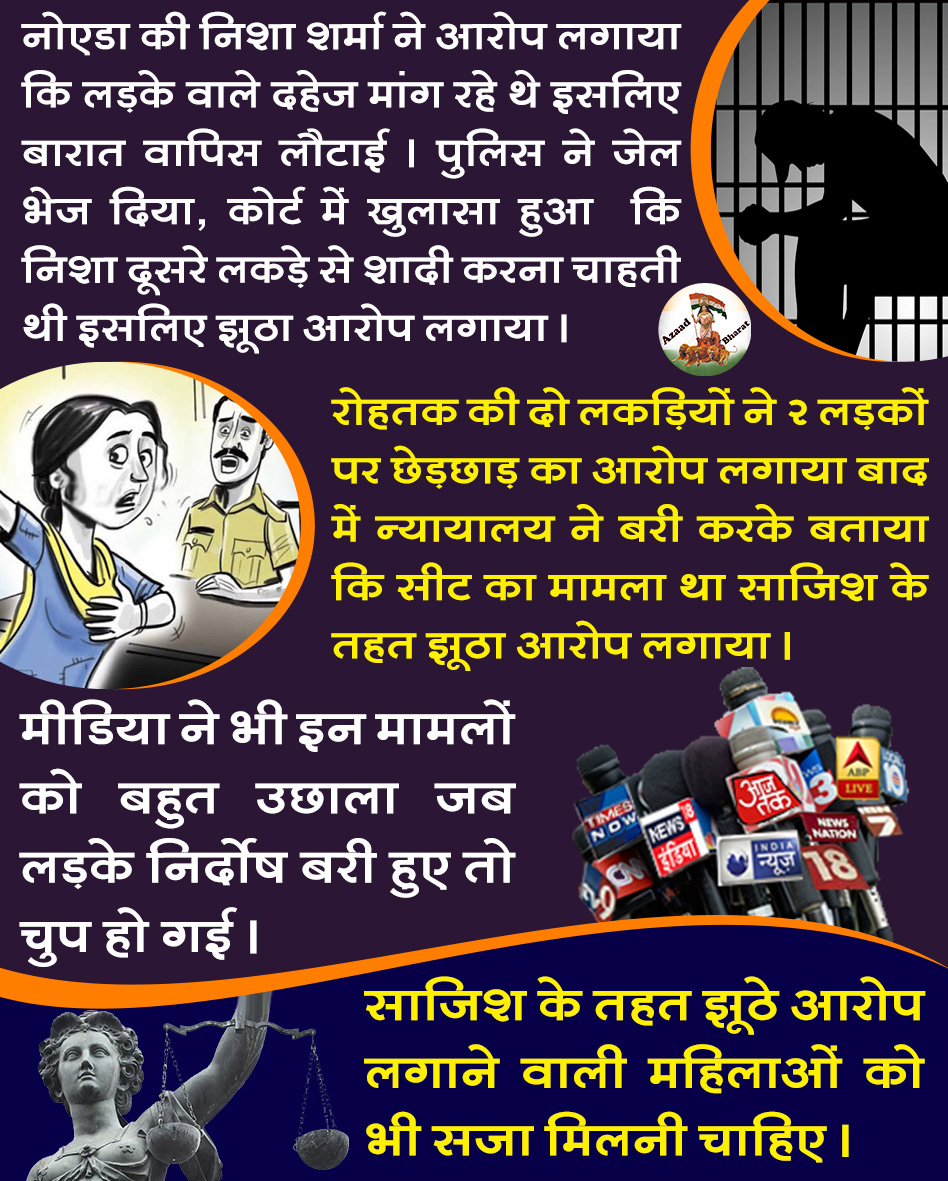*जनता का कहना है कि झूठे आरोप लगाने वाली लड़कियों को सजा मिलनी चाहिए और इसमें पुलिस भी साजिस में शामिल है तो उनको भी सजा होनी चाहिए, पैसे और टीआरपी के लिए मीडिया निर्दोष पुरषों को बदनाम करती है उनपर भी सख्त कार्यवाही होनी चाहिए।*