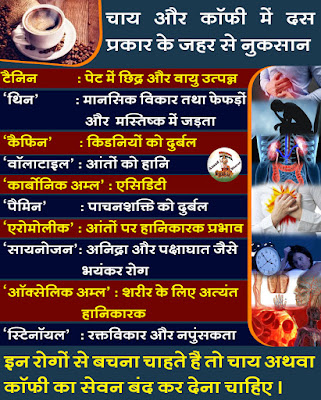 ●चाय से भूख मर जाती है, दिमाग सूखने लगता है, गुदा और वीर्याशय ढीले पड़ जाते हैं। डायबिटीज़ जैसे रोग होते हैं। दिमाग सूखने से उड़ जाने वाली नींद के कारण आभासित कृत्रिम स्फूर्ति को स्फूर्ति मान लेना, यह बड़ी गलती है। चाय-कॉफी के विनाशकारी व्यसन में फँसे हुए लोग स्फूर्ति का बहाना बनाकर हारे हुए जुआरी की तरह व्यसन में अधिकाधिक गहरे डूबते जाते हैं। वे लोग शरीर, मन, दिमाग और पसीने की कमाई को व्यर्थ गँवा देते हैं और भयंकर व्याधियों के शिकार बन जाते हैं।*