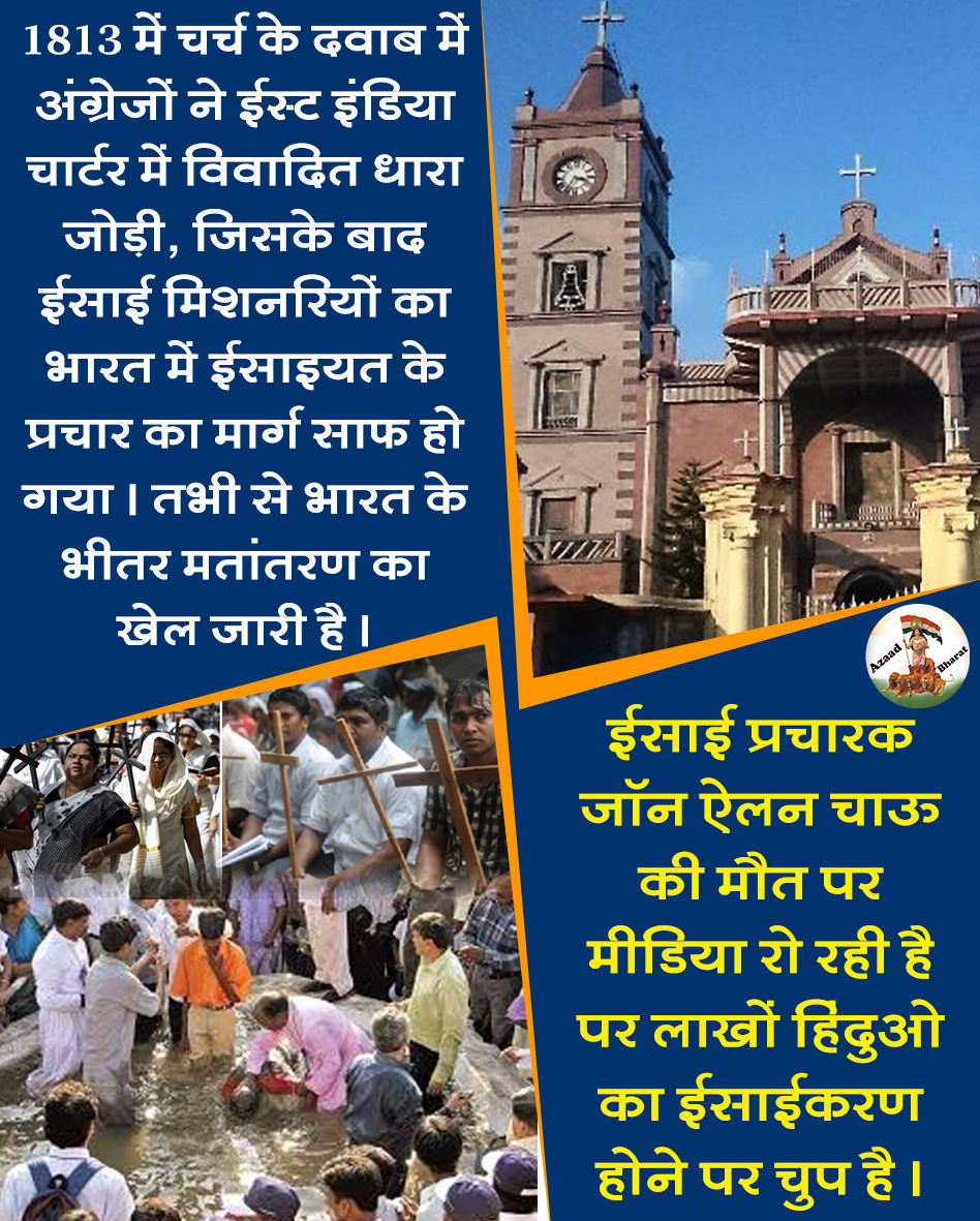 भारत की सनातन परंपरा सदियों से भय, लालच और धोखे का शिकार रही है । देश में अधिकांश चर्चों और ईसाई मिशनरियों की विकृत ‘सेवा’ उसी गुप्त एजेंडे का हिस्सा है जिसकी नींव 15वीं शताब्दी में गोवा में पुर्तगालियों के आगमन और 1647 में ब्रितानी चैपलेन ने मद्रास पहुंचने पर रखी थीं । 1813 में चर्च के दवाब में अंग्रेजों ने ईस्ट इंडिया चार्टर में विवादित धारा जोड़ी, जिसके बाद ब्रिटिश पादरियों और ईसाई मिशनरियों का भारत में ईसाईयत के प्रचार-प्रसार का मार्ग साफ हो गया । तभी से भारतीय समाज के भीतर मतांतरण का खेल जारी है । आज भी स्वतंत्र भारत के कई क्षेत्रों में खुलेआम कथित आत्मा का कुत्सित व्यापार-विदेशी वित्तपोषित स्वयंसेवी संगठनों के समर्थन और वामपंथियों सहित स्वयंभू सेक्युलरिस्टों की शह पर धड़ल्ले से चल रहा है ।