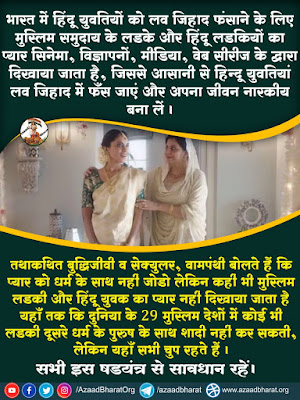 भारत देश हिंदू बाहुल्य है हिंदू सहिष्णु होते है उसका फायदा वामपंथी, तथाकथित बुद्धिजीवी, सेक्युलर, बॉलीवुड और मीडिया वाले जमकर फायदा उठाते हैं। वें हमेशा हिंदू विरोधी गतिविधियों को बढ़ावा देते हैं। वें दिन रात इसमे ही लगे रहते हैं कि कैसे भी करके हिंदू संस्कृति को कैसे मिटाया जाए, वे फिल्में, विज्ञापनों, वेब सिरजो, इंटरनेट, पुस्तके, मीडिया, टीवी आदि द्वारा हिंदुओं का ब्रेनवॉश करते हैं। इन षडयंत्र को भोले हिंदू समझते नहीं हैं। वें अपने बच्चों को महान सनातन हिंदू धर्म के संस्कार नही देते हैं। जिसके कारण बच्चे भी सेक्युलर बन जाते हैं और फिल्मे, सीरियल आदि देखकर अपने धर्म से ही नफरत करने लग जाते हैं और कुछ लड़कियां तो लव जिहाद में फंस जाती हैं फिर पूरी जिंदगी नारकीय जीवन जीती हैं फिर कुछ कर नही पाती हैं माँ-बाप भी दुखी हो जाते हैं।