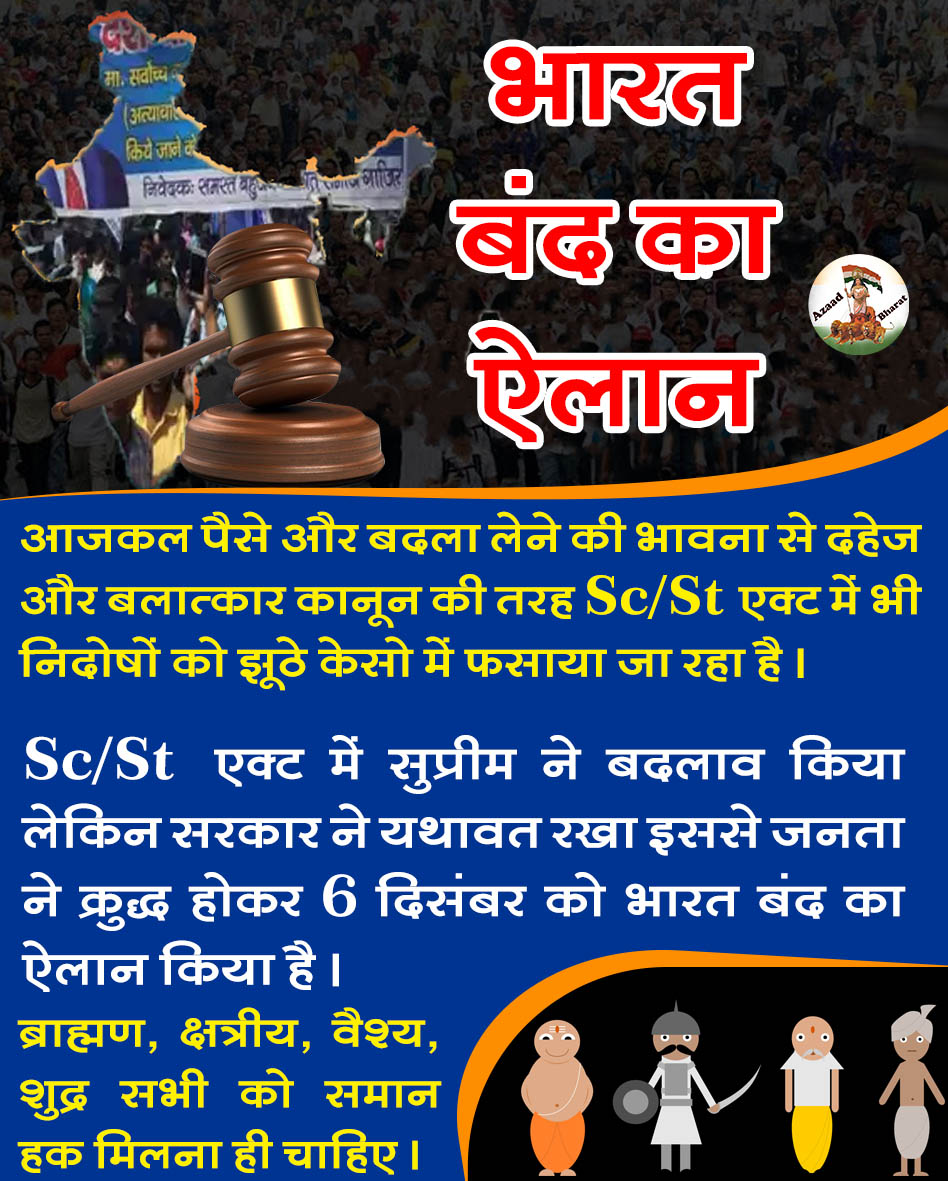 मात्र एक शिकायत पर किसी भी व्यक्ति को दोषी मान कर गिरफ्तार कर लेना और उसकी जमानत तक नहीं होने देना और 70 वर्षों से चली आ रही जातिगत आरक्षण व्यवस्था की समीक्षा की मांग को लेकर जनता ने 6 सितंबर 2018 को प्रातः 10:00 बजे से 4:30 बजे तक भारत बंद का आवाहन किया है ।