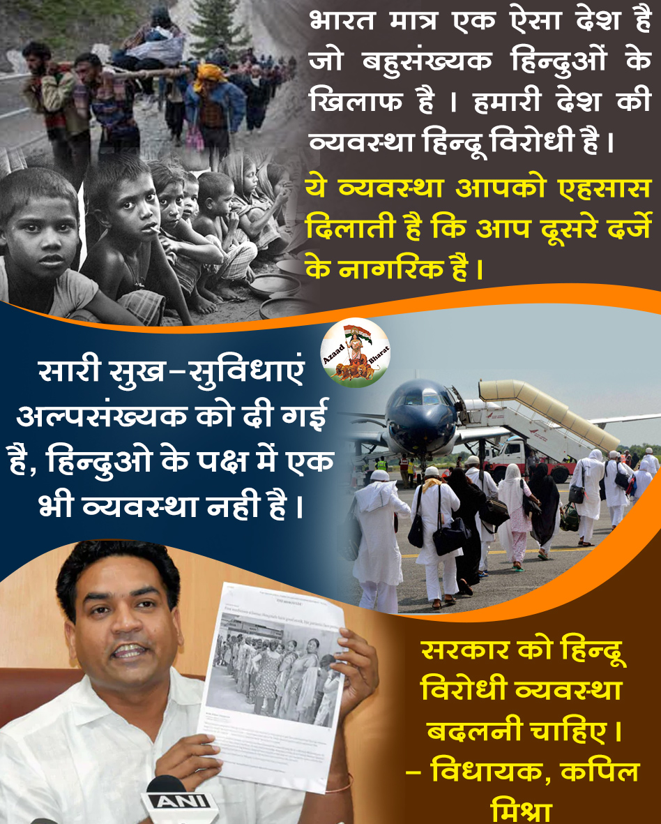 हमारा कोई सेक्युलर राज्य नहीं है हिन्दू राज्य बनाने की बात लोग करते हैं, लेकिन अभी जो हमारी राज्य व्यवस्था है कि हिन्दू विरोधी राज्य व्यवस्था है ये राज्य व्यवस्था आपको मोटिवेट करती है कि आप हिन्दू धर्म को छोड़े, ये राज्य व्यवस्था आपको इस प्रकार का रोज सुबह उठने के साथ सोने तक ये एहसास कराती है कि आप इस देश में सेकंड क्लास है डिवीजन है, दूसरे दर्जे के नागरिक हैं । आप देश के अन्य नागरिकों के बराबर नहीं है । आपका बच्चा अगर पैदा होगा तो उसके अधिकार किसी अन्य धर्म में पैदा होने वाले बच्चों से कम होंगे । किसी अन्य धर्म में पैदा होता है तो सरकार उसे पैसा देगी, पढ़ने जाएगा तो सरकार उसे बस्ता देगी, किताब देगी, स्कॉलरशिप देगी, रिजर्वेशन देगी, नौकरी केवल धर्म आधारित पैसा रिजर्वेशन, व्रोटेशन, मोटिवेशन केवल और केवल धर्म आधारित पैसा रिजर्वेशन, प्रोक्शन, संगठन , मोटिवेशन इस देश की राज्य व्यवस्था दे रही है । उसमें भी शब्द यूज़ करते है कि minority अल्पसंख्यक। मेरे को लगता है पूरे ब्रह्मांड में 25 करोड़ वाला अल्पसंख्यक केवल भारत में ही बैठा हुआ है । और वो इतना अल्पसंख्यक है कि उसके हर बच्चे के 7-8 बच्चे पैदा हो रहे हैं । जब ये कहा गया कि मुसलमानों  की तरक्की के लिए योजना लाओ तो मुझे लगता है कि नसबन्दी की योजना सबसे बड़ी योजना है जिससे मुसलमानों की तरक्की हो सकती है ।