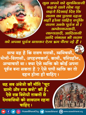 समाचार पत्रों से मालूम चला जहाँ देश में सभी स्थानों पर दशहरा को रावण का दहन किया जायेगा वहीं कुछ अपने आपको मूल निवासी कहने वाले लोग यह कहते दिखाई दिए कि रावण का पुतला दहन नहीं होना चाहिए क्यूंकि रावण उनके पूर्वज थे। ये बयान निश्चित रूप से सुर्खियां बटोरने के लिए दिए जाते हैं। पिछले कुछ वर्षों से कभी अम्बेडकरवादी, साम्यवादी, आदिवासी आदि संगठन भी रावण को अपना पूर्वज बताकर ऐसा भ्रम फैला रहे हैं। सत्य यह है कि इन्होंने कभी वाल्मीकि रामायण को ही नहीं पढ़ा। उसमें रावण का कैसा चरित्र वर्णित है यह भी नहीं जाना। अन्यथा ऐसा अज्ञानता भरी बात ये लोग कभी नहीं करते।