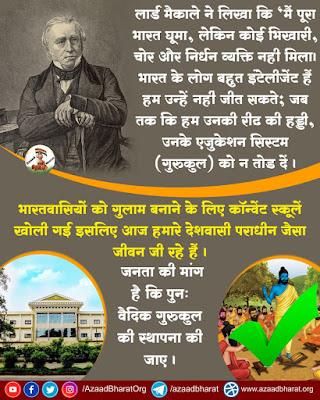 “मैं पूरा भारत घूमा, वहाँ पर ना ही मुझे कोई भिखारी दिखा और ना ही मुझे कोई चोर मिला, मुझे किसी भी तरह से ना ही कोई धन की कमी दिखाई दी । वहाँ पर लोगों की मोरल वैल्यूज बहुत ऊँची हैं, लोग बहुत इंटेलीजेंट हैं व उनका कैलिबर इतना ज्यादा है कि हम उन्हें नहीं जीत सकते; जब तक कि हम उनकी रीढ़ की हड्डी, उनके एजुकेशन सिस्टम को न तोड़ दें यानि उनकी आध्यात्मिक व सांस्कृतिक विरासत को खत्म न कर दें, भारत को जीतना मुश्किल ही नहीं असंभव है । इसलिए मेरा (लार्ड मैकाले) प्रस्ताव है कि उनके पुराने एजुकेशन सिस्टम व उनकी सांस्कृतिक विरासत को पहले खत्म किया जाए और उन्हें भरोसा दिलाया जाए कि ये सिस्टम सही नहीं है । उन्हें भरोसा दिलाया जाए कि इंग्लिश अच्छी है और उनके पुराने एजुकेशन सिस्टम से बेहतर है ताकि उनका स्वाभिमान (आत्म-सम्मान) खत्म हो जाये और वे अपनी मूल संस्कृति से भटक जाएँ । तभी जो हम चाहते हैं वो हो सकता है, यानि तभी हम उन पर हावी हो सकते हैं; अन्यथा नहीं ।”