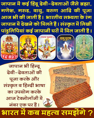 भातीय सभ्यता अपनाकर, हिन्दू देवी-देवताओं की पूजा करके एवं संस्कृत व हिन्दी भाषा का प्रयोग करके जापान दुनिया मे टेक्नोलॉजी में नंबर एक पर है, आज उस देश के सामने कोई भी देश आंख नही दिखा सकता लेकिन भारत में ऐसी विडंबना है कि भारतवासी अपने ही हिन्दू देवी-देवताओं को भूल रहे है, कई तो मुर्दों की मजार पर मत्था टेकने चले जाते हैं। अपनी संस्कृति को भूलकर पाश्चात्य संस्कृति की ओर आकर्षित हो रहे हैं, अपनी महान संस्कृत एवं हिन्दी भाषा को भूलकर अंग्रेजी भाषा को अपना रहे हैं, कितनी विडंबना है, हमारी संस्कृति को भूलने के कारण ही आज हम पीछे रह गये और जापान हमारी संस्कृति को अपनाकर महान बन रहे हैं ।