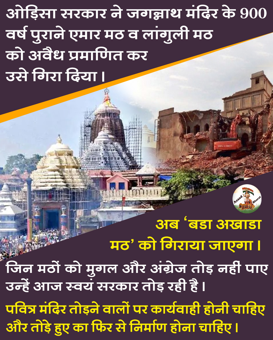 जगन्नाथ पुरी में 12 वीं शताब्दी से अविरत धर्म कार्य की धुरी बने कई महत्वपूर्ण मठ-मंदिरों को तोड़ा जा रहा है। इसे कुछ भी कर के तत्काल रोका जाना चाहिए। भगवान जगन्नाथ जी के मंदिर की सुरक्षा के बहाने उन्हीं मठों को निशाना बनाया जा रहा है जिन्होंने भगवान जगन्नाथ मंदिर को औरंगज़ेब और कई आतताइयों से बचाया था। उसके लिए यही मठ मंदिर ढाल बने। उसमें रहने वाले साधु और भक्तों ने बलिदान दिए। उनकी उपस्थिति का अर्थ मंदिर की चिर काल तक सुरक्षा थी । परंतु जिन्होंने शताब्दियों तक जगन्नाथ मंदिर को बचाया, आज दुर्भाग्य से उन्हीं मठों को बचाने वाला कोई नहीं है !