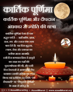 इसलिए कार्तिक पूर्णिमा केवल एक पर्व नहीं, बल्कि आत्मा के जागरण का संदेश है — अपने भीतर के प्रकाश को पहचानो, और वही प्रकाश समाज तक फैलाओ। यही कार्तिक पूर्णिमा का सच्चा अर्थ है — अंधकार से ज्योति की, अज्ञान से ज्ञान की, और असत्य से सत्य की यात्रा।