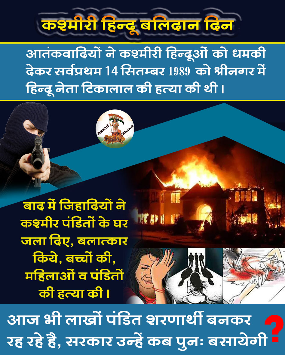 आतंकवादियों ने इसी दिन कश्मीरी हिन्दूओं को धमकी देकर सर्वप्रथम 14 सितम्बर 1989 को श्रीनगर में हिन्दू नेता टिकालाल की हत्या की थी ।
