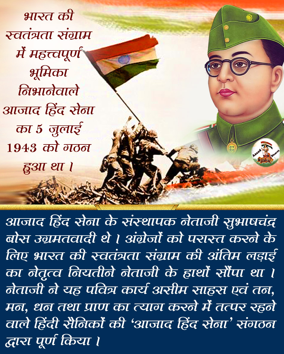 पूर्व एशियाई देशोंमें जर्मनीका मित्रराष्ट्र #जापानकी सेना #ब्रिटिश सेनाको धूल चटा रही थी । उनके पास भी शरण आए हुए, ब्रिटिश सैनाके हिंदी सैनिक थे । नेताजीके मार्गदर्शनानुसार वहां पहलेसे ही रहनेवाले #रासबिहारी बोसने हिंदी सेनाका संगठन किया । इस हिंदी सेनासे मिलने नेताजी 90 दिन पनडुब्बीसे यात्रा करते समय मृत्युसे जूझते जुलाई वर्ष 1943 में जापानकी राजधानी #टोकियो पहुंचे । #रासबिहारी बोसजीने इस सेनाका नेतृत्व नेताजीके हाथों सौंपकर दिया । 5 जुलाई 1943 को सिंगापुरमें नेताजीने ‘आजाद हिंद सेना’की स्थापना की । उस समय सहस्रों सैनिकोंके सामने ऐतिहासिक भाषण करते हुए वे बोले, ‘‘सैनिक मित्रों ! आपकी युद्धघोषणा एक ही रहे ! #चलो दिल्ली ! आपमें से कितने लोग इस स्वतंत्रतायुद्धमें जीवित रहेंगे, यह तो मैं नहीं जानता; परंतु मैं इतना अवश्य जानता हूं कि अंतिम विजय अपनी ही है। इसलिए उठो और अपने अपने शस्त्रास्त्र लेकर सुसज्ज हो जाओ । हमारे भारतमें आपसे पहले ही क्रांतिकारकोंने हमारे लिए मार्ग बना रखा है और वही मार्ग हमें दिल्लीतक ले जाएगा । ….चलो दिल्ली ।”