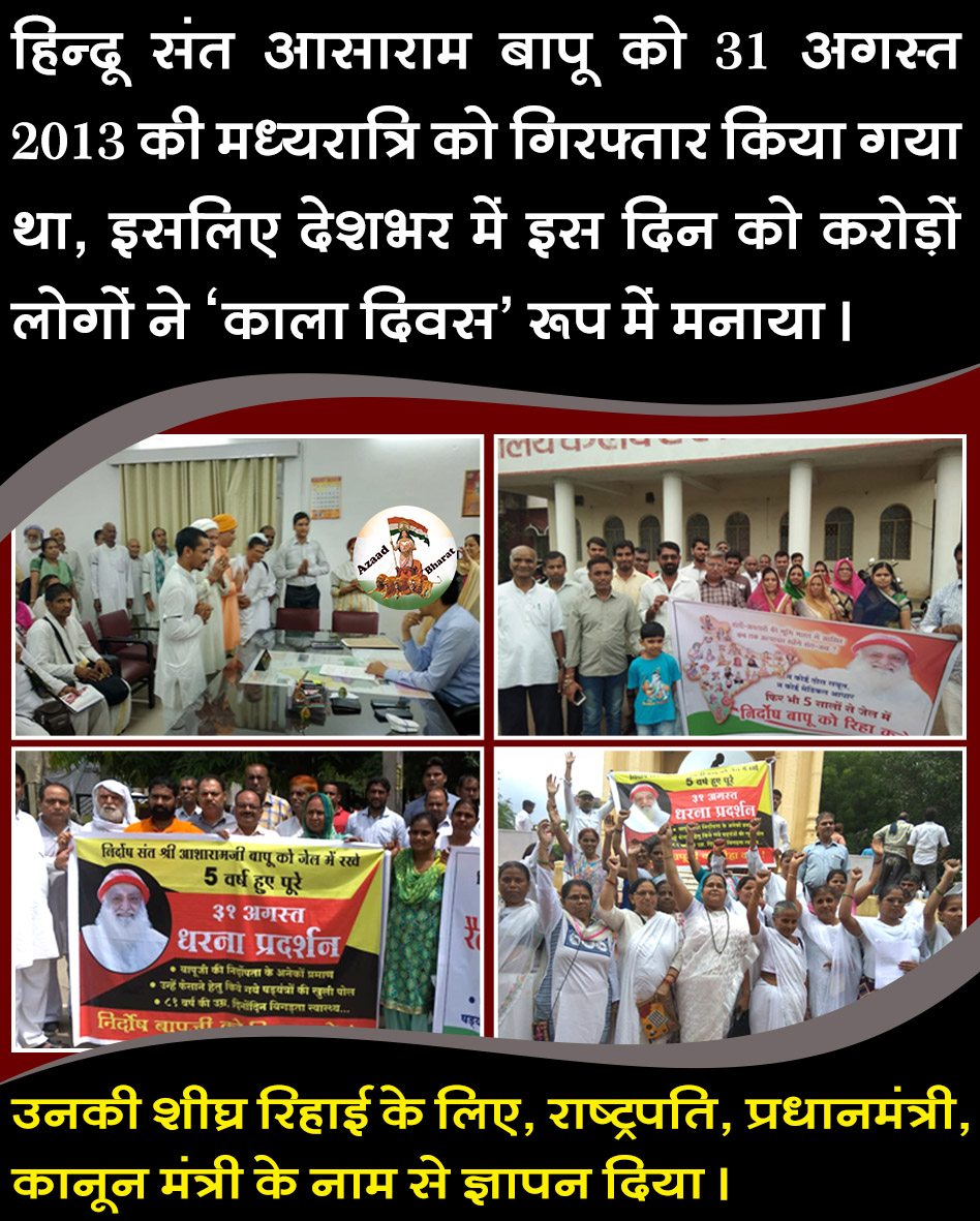 आपको बता दें कि हिन्दू संत आसाराम बापू को 31 अगस्त 2013 को मध्यरात्री को बीमार अवस्था मे इंदौर से गिरफ्तार किया था ।