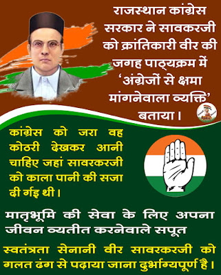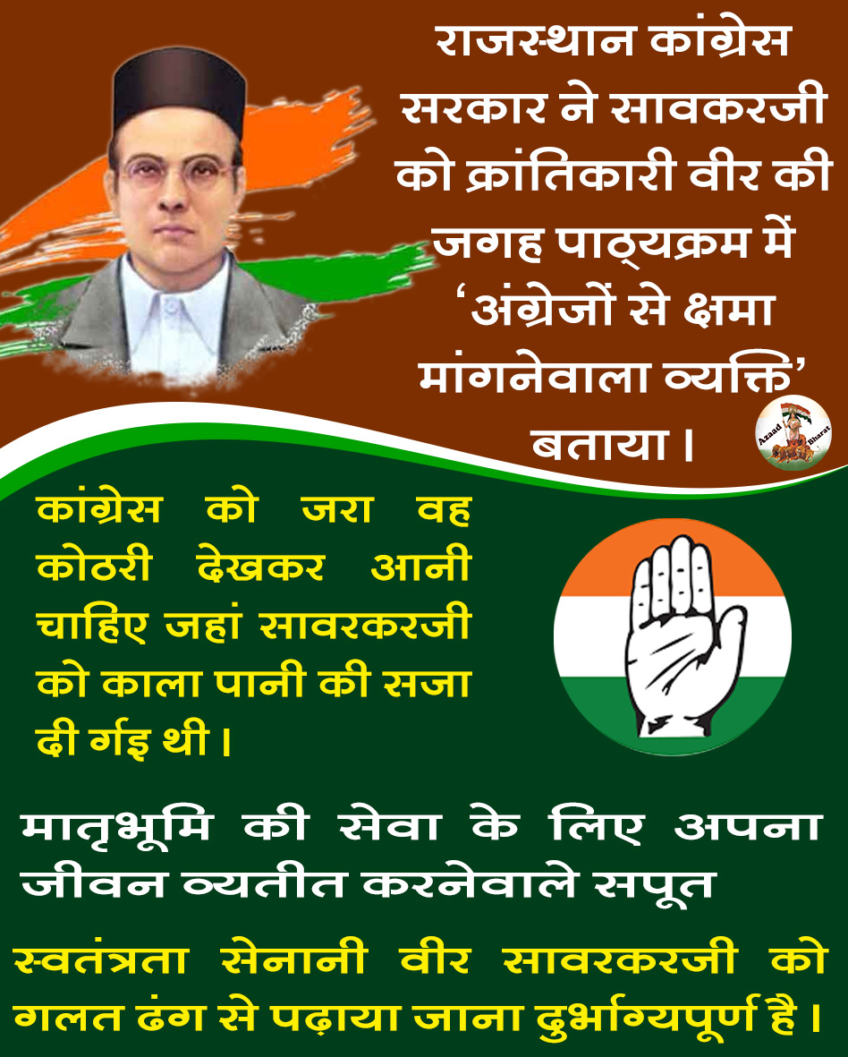 राजस्थान मे पिछली भाजपा सरकार में किताबों मे जनसंघ के वीरसावरकर को महान क्रांतिकारी, देशभक्त और आजीवन देश की स्वतंत्रता का तप करनेवाला बताया था, लेकिन कांग्रेस सरकार ने आते ही तमाम संघ से जुड़े हुए शहीदों की कहानी पाठ्यक्रम में बदलनी शुरु कर दी । लोकसभा चुनाव राजस्थान में खत्म हुआ ही है कि कांग्रेस सरकार ने वीर सावरकर को दसवीं की किताब मे ‘कारागार से बाहर आने के लिए अंग्रेजों से क्षमा मांगनेवाला व्यक्ति’ उल्लेखित किया है ।
