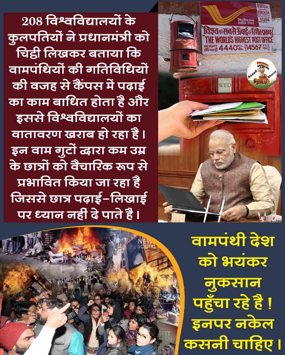 जेएनयू में 5 जनवरी को हुए हिंसा के बाद देश के 208 विश्वविद्यालयों के कुलपतियों ने प्रधानमंत्री नरेंद्र मोदी को पत्र लिखा है। जिसमें वामपंथियों के कैंपस में हिंसक गतिविधियों पर चिंता जाहिर की है। चिट्ठी में 208 विश्वविद्यालयों के कुलपति के हस्ताक्षर भी हैं। इस चिट्ठी में लिखा गया है कि, वामपंथी कार्यकर्ताओं की गतिविधियों की वजह से कैंपस में पढ़ाई-लिखाई काम बाधित होता है और इससे विश्वविद्यालयों का वातावरण खराब हो रहा है। इन कुलपतियों ने आरोप लगाया है कि इन वाम गुटों द्वारा कम उम्र के छात्रों को वैचारिक रूप से प्रभावित किया जा रहा है जिससे नए छात्र पढ़ाई-लिखाई पर ध्यान नहीं दे पाते हैं।*