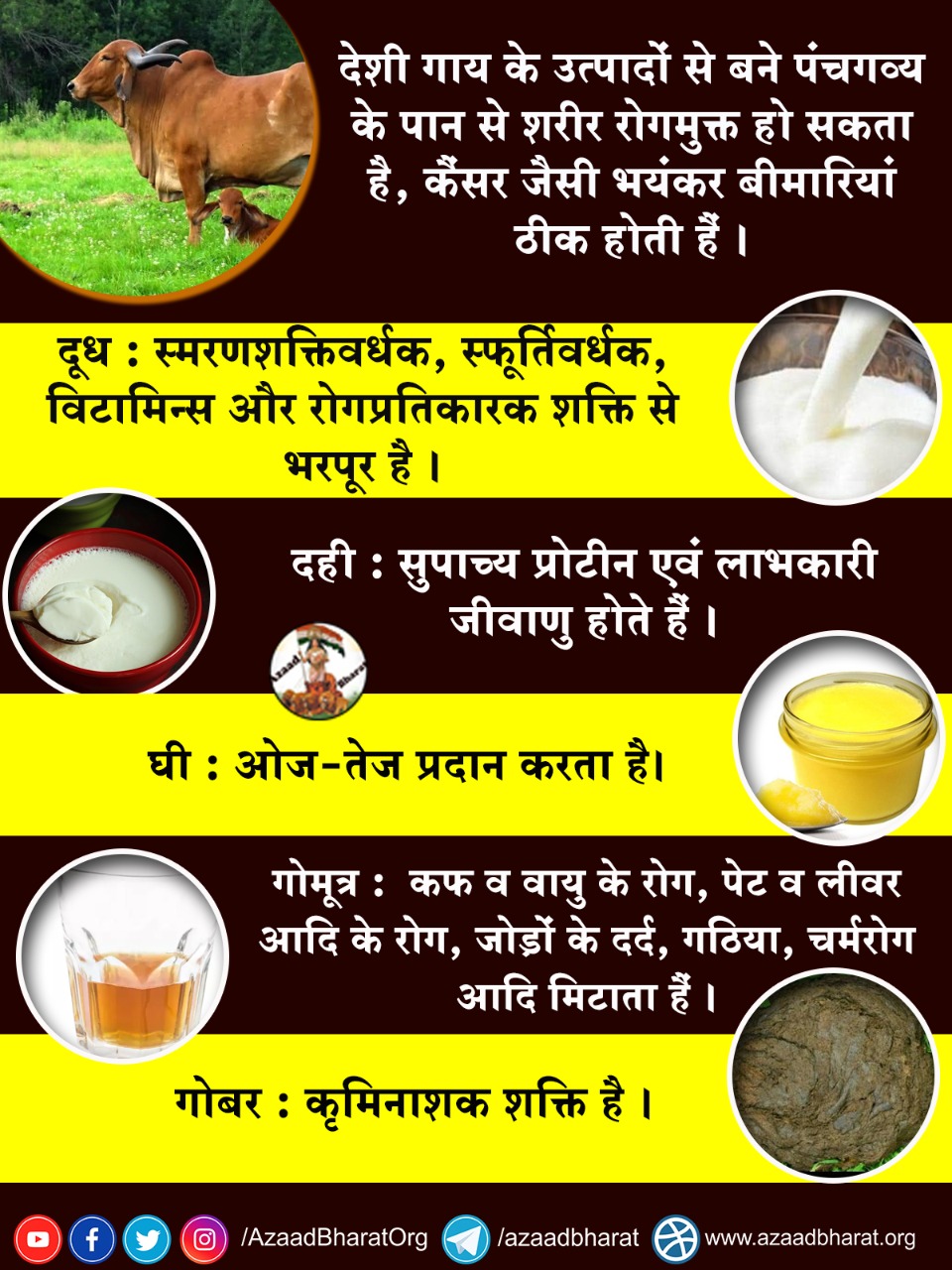 आपको बता दे कि देशी गाय का दूध, दही, घी, गोबर व गोमूत्र सम्पूर्ण मानव-जाति के लिए वरदानरूप हैं। दूध स्मरणशक्तिवर्धक, स्फूर्तिवर्धक, विटामिन्स और रोगप्रतिकारक शक्ति से भरपूर है। दही में सुपाच्य प्रोटीन एवं लाभकारी जीवाणु होते हैं जो क्षुधा को बढ़ाने में सहायता करते हैं। घी ओज-तेज प्रदान करता है। इसी प्रकार गोमूत्र कफ व वायु के रोग, पेट व यकृत (लीवर) आदि के रोग, जोड़ों के दर्द, गठिया, चर्मरोग आदि सभी रोगों के लिए एक उत्तम औषधि है। गाय के गोबर में कृमिनाशक शक्ति है। जिस घर में गोबर का लेपन होता है वहाँ हानिकारक जीवाणु प्रवेश नहीं कर सकते। पंचामृत व पंचगव्य का प्रयोग करके असाध्य रोगों से बचा जा सकता है। ये हमारे पाप-ताप भी दूर करते हैं। गाय से बहुमूल्य गोरोचन की प्राप्ति होती है।