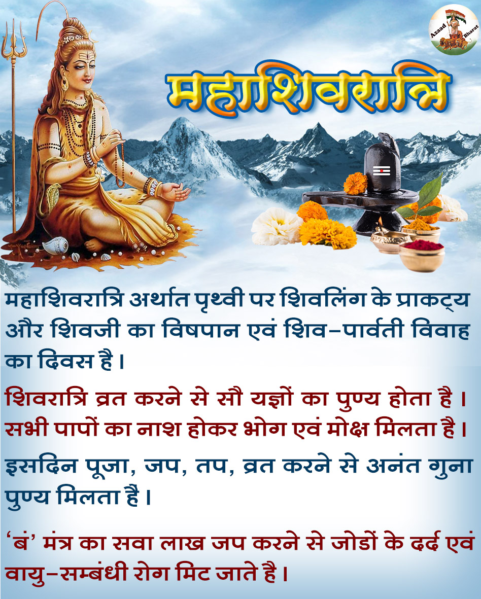 यदि महाशिवरात्रि के दिन ‘बं’ बीजमंत्र का सवा लाख जप किया जाय तो जोड़ों के दर्द एवं वायु-सम्बंधी रोगों में विशेष लाभ होता है ।*