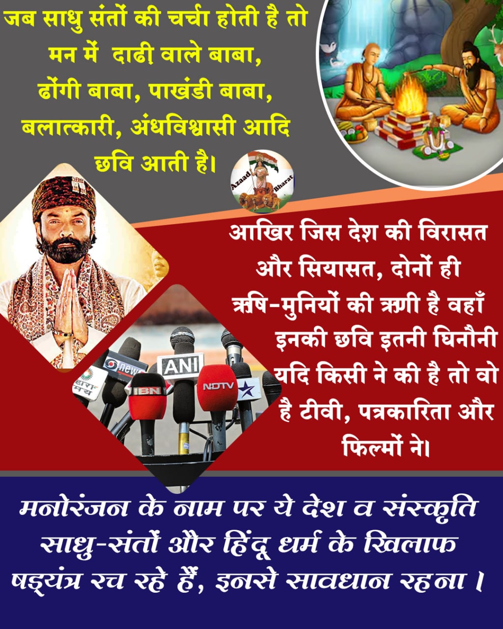 आखिर जिस देश की विरासत और सियासत, दोनों ही ऋषि-मुनियों की ऋणी है वहीं पर इनकी छवि इतनी घिनौनी कैसे हो गई? 200 साल तक हम अंग्रेजों की गुलामी में रहे और अन्ततः 1947 में हम आजाद हुए लेकिन देश और धर्म विरोधी ताकतों की गुलामी चालू रही।
