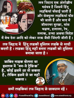प्रेम अन्धा होता है, सभी धर्म समान हैं, शादी ब्याह में धर्म नहीं दिल देखा जाता है, मुसलमान भी तो इंसान हैं, यह कहने वाले एक बार विचार करें, जो हिन्दू लड़कियां सोचती हैं कि लव जेहाद जैसा कुछ नहीं होता तो उन्हें सोचना चाहिए की क्या कोई मुस्लिम लड़की लव मैरिज करके हिन्दू लड़के की पत्नी बन सकती है? इस्लाम के तथाकथित विद्वान ज़ाकिर नाइक खुद फ़रमा चुके हैं कि इस्लाम “वन-वे ट्रेफ़िक” है, कोई इसमें आ तो सकता है, लेकिन इसमें से जा नहीं सकता… क्या दोनो एक ही घर में अपने-अपने धर्म का पालन नहीं कर सकते? मुस्लिम बनना क्यों जरूरी है? और यही बात उनकी नीयत पर शक पैदा करती है।