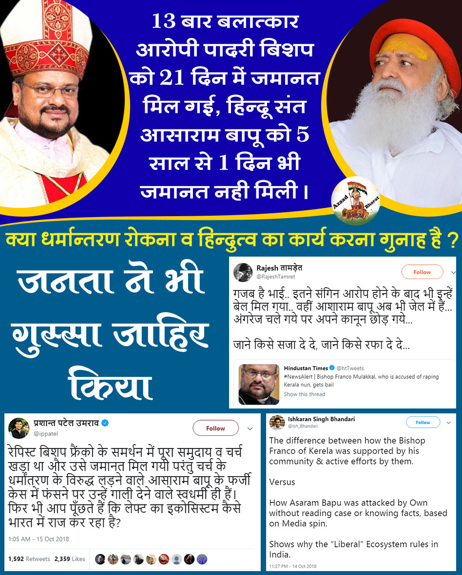 कानून एक समान बोलने वाले अब कहाँ गए, जालन्धर के ईसाई पादरी बिशप ने केरल की नन के साथ कई बार बलात्कार किया ऐसा आरोप लगाया गया, फिर भी तुरंत जमानत मिल गई, लेकिन 82 वर्षीय हिन्दू संत आसाराम बापू को अभी तक जमानत नहीं मिल पाई ।