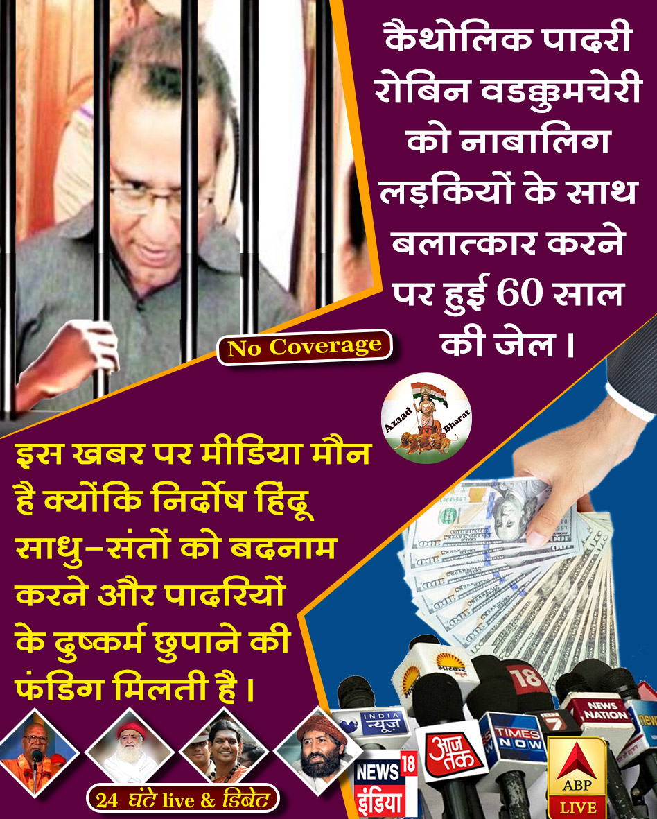 बता दें कि अभी हाल ही में एक पादरी को 60 साल की सजा सुनाई गई है पर 2-4 को छोड़कर किसी भी मीडिया चैनल में ये खबर नहीं । 2-4 मीडिया ने कवर किया है वे भी एकदम छोटा सा किसी कोने में जो पता ही न चले ।
