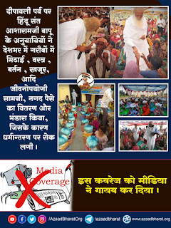 दीपावली के पावन पर्व पर एक तरफ हम मिठाई खाते हैं, नये कपड़े पहनते हैं, खुशियां मनाते हैं, लेकिन उन गरीबों का क्या जिनके पास पैसे नहीं हैं वो कैसे दीपावली मनायेंगे? गरीब भी अच्छी दिवाली मना जा सकें इस निमित्त हिंदू संत आशाराम बापू के अनुयाइयों ने देशभर में आदिवासी क्षेत्रों में जाकर मिठाई, कपड़े, खजूर, चप्पल, बर्तन आदि जीवनोपयोगी सामग्री एवं नगद पैसे और शिरा पुलाव आदि का