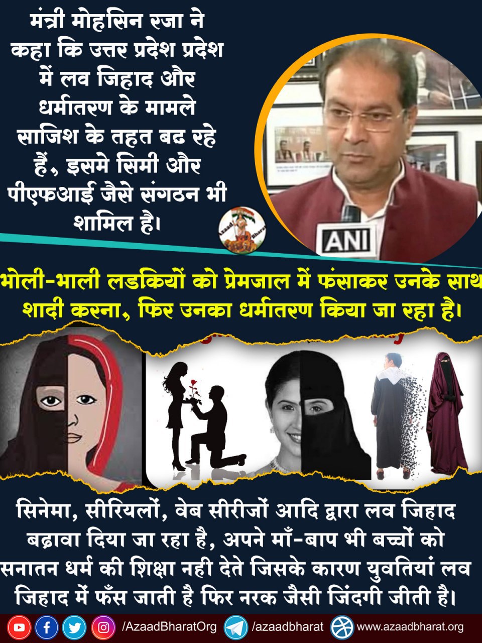ध्यान देने योग्य है कि जिहाद का सबसे खुफिया रूप अगर किसी को माना जा सकता है तो वो लव जिहाद है जिस पर अब उत्तर प्रदेश के योगी मंत्रिमंडल के एक मुस्लिम मंत्री की मुहर लग गई है। उत्तर प्रदेश के अल्पसंख्यक कल्याण राज्यमंत्री मोहसिन रजा ने प्रदेश में बढ़ते लव जिहाद के मामलों को लेकर बड़ा बयान दिया है। उन्होंने कहा कि ‘राज्य में साजिश के तहत लव जिहाद के मामले बढ़ रहे हैं।’