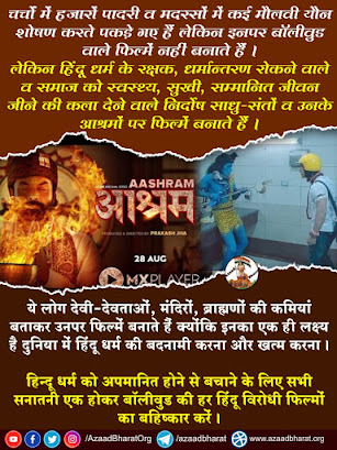 सभी सनातनियों से निवेदन है कि “आश्रम” व अन्य हिंदू विरोधी फिल्मों को देखे ही नहीं। इससे अपने आप ये लोग ऐसी फ़िल्में बनाना बंद कर देंगे और यूट्यूब पर वीडियो को रिपोर्ट और डिसलाइक जरूर करें तभी सनातन धर्म विरोधी लोगों की आँखे खुलेगी।