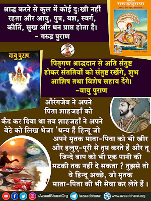 औरंगजेब ने अपने पिता शाहजहाँ को कैद कर दिया था तब शाहजहाँ ने अपने बेटे को लिख भेजाः “धन्य हैं हिन्दू जो अपने मृतक माता-पिता को भी खीर और हलुए-पूरी से तृप्त करते हैं और तू जिन्दे बाप को एक पानी की मटकी तक नहीं दे सकता? तुझसे तो वे हिन्दू अच्छे, जो मृतक माता-पिता की भी सेवा कर लेते हैं।”