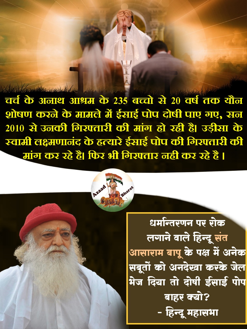हिन्दू सेना के राष्ट्रीय अध्यक्ष श्री विष्णु गुप्ता ने कहा बापू आसारामजी कि लीगल टीम को न्यायाधीश के विरुद्ध अपील में जाना चाहिए। हिन्दू सेना न्यायाधीश पर कार्यवाही कि मांग करेगी, सरकार को चेतावनी देगी। राष्ट्र व्यापी आंदोलन करेगी। जो अवसरवादी राजनेता है, तथाकथित हिन्दू संगठन हैं, साधु-संत हैं, हिंदूवादी होने का दावा करते हैं, वे बेनकाब हो चुके हैं । कांग्रेस के पप्पू को इस जन्म में यदि प्रधानमंत्री बनना है तो अधर्मी गुरु ईसाई पोप की शरण छोड़कर अहमद पटेल और सोनिया गांधी के साथ बापूजी के आश्रम में सेवा खोजने के लिए जाना चाहिए और अपने पापों का प्रायश्चित करना चाहिये। संत आसारामजी बापू जोधपुर जेल में तो ईसाई पोप जेल से बाहर कैसे? चर्च के अनाथ आश्रम के 235 शारीरिक मानसिक अपंग बच्चों से 20 वर्ष तक यौन शोषण करने के मामले में ईसाई पोप दोषी पाए गए, सन 2010 से उनकी गिरफ्तारी कि मांग हो रही है।सन 2008 से उड़ीसा के स्वामी लक्ष्मणानंद के हत्यारे ईसाई पोप कि गिरफ्तारी कि मांग हिन्दू संगठन कर रहे हैं ।