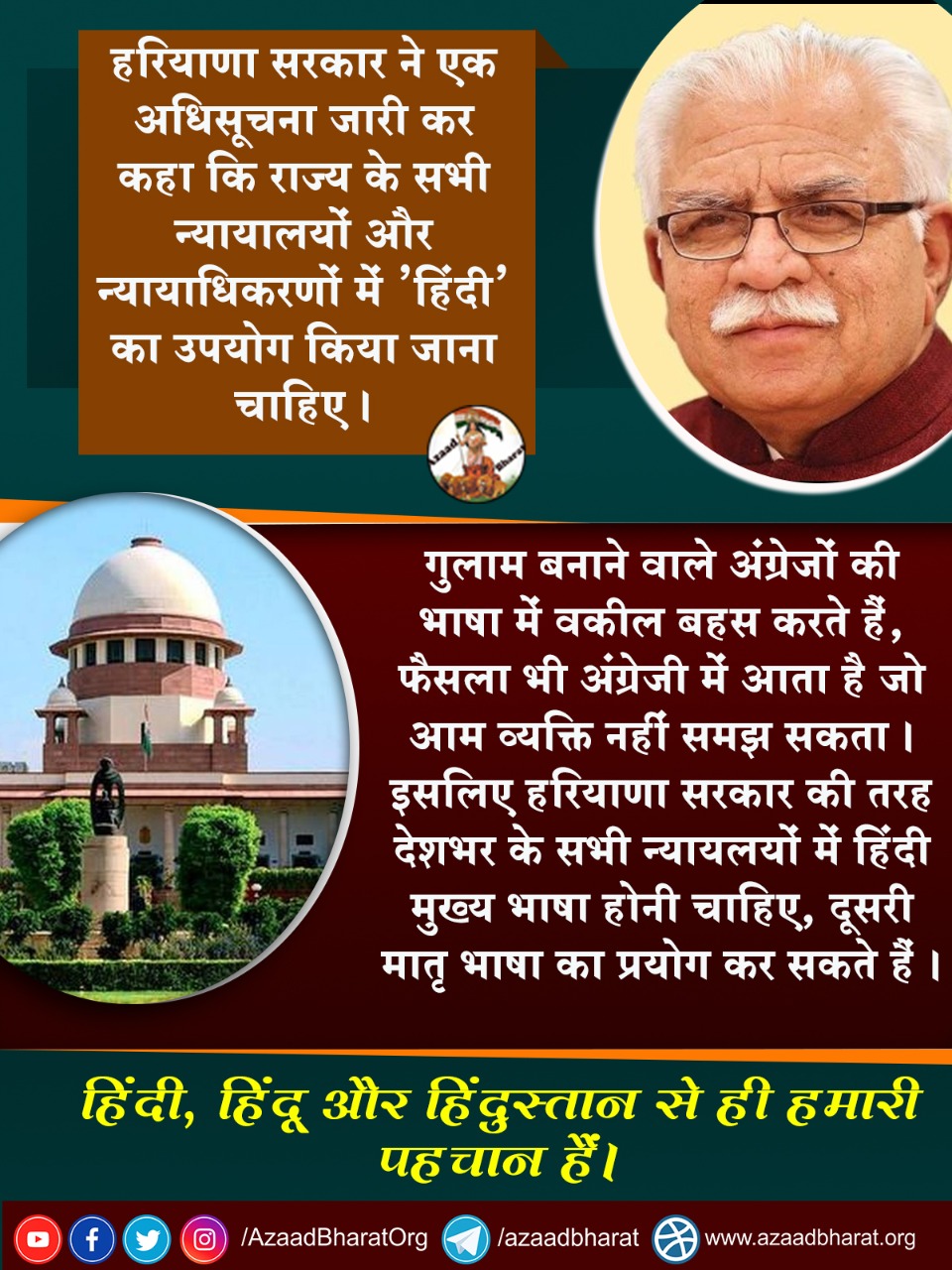 भारत की राष्ट्र भाषा हिंदी है और देश मे अधिकतर भारतवासी हिंदी ही समझते है लेकिन फिर भी न्यायालय और सरकारी कार्यालय में हिंदी की जगह अंग्रेजी भाषा का प्रयोग होता है बड़ा आश्चर्य की बात है और वे भी हमे 200 साल गुलाम रखने वालों की भाषा का प्रयोग कर रहे है भारत मे अधिकतर लोगों को अंग्रेजी भाषा नहीं आने के कारण वे न्यायालय की बहस और फैसले भी समझ नही पाते और सरकारी कार्यलय की तरफ से क्या निर्देश है वे भी समझ नही पाते है इसलिए अब समय आ गया है कि हरियाणा सरकार की तरह देशभर की न्यायालय से अंग्रेजी खत्म कर दी जाए और हिंदू का मुख्य रूप से कार्य चल ओर स्थानीय भाषा का थोड़ा बहुत प्रयोग किया जाए।