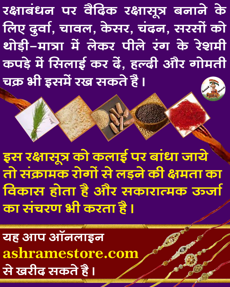 ‘इस पर्व पर धारण किया हुआ रक्षासूत्र सम्पूर्ण रोगों तथा अशुभ कार्यों का विनाशक है । इसे वर्ष में एक बार धारण करने से वर्ष भर मनुष्य रक्षित हो जाता है ।’ (भविष्य पुराण)
