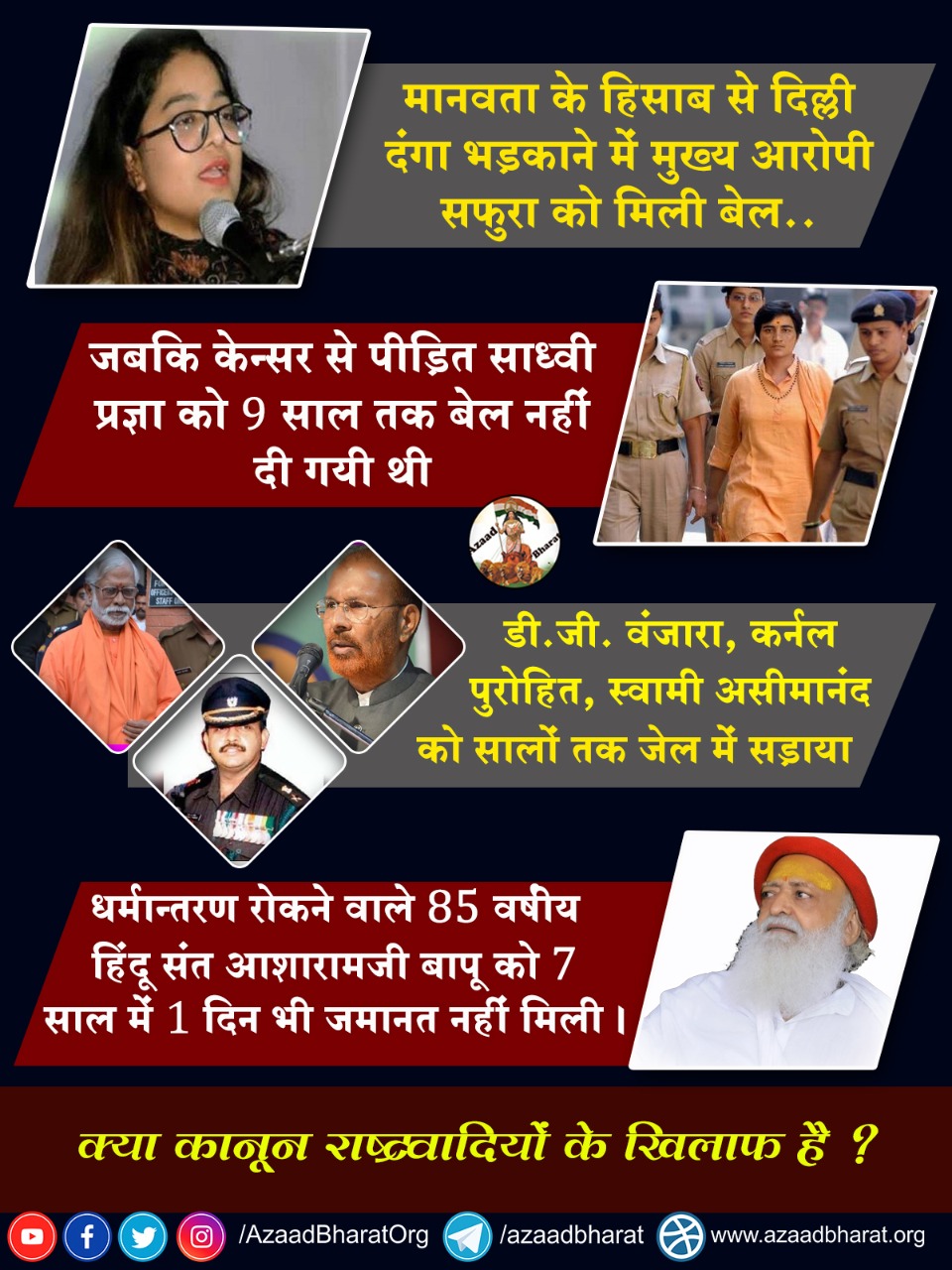लेकिन वहीं साध्वी प्रज्ञाजी को 9 साल, डीजी वंजाराजी को 8 साल, स्वामी असीमानन्दजी को 8 साल, कर्नल पुरोहित 7 साल, केशवानन्दजी महाराज, शंकराचार्य आदि को सालों तक जेल में रखा गया, अमानवीय यातनाएं दी गई लेकिन जमानत नही दी गई।