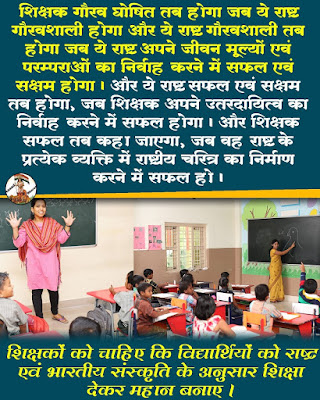 हर वर्ष हम 5 सितंबर को शिक्षिक दिवस तो मना लेते हैं पर शिक्षक का हमारे जीवन और राष्ट्र के लिए कितना महत्व है ये नही जानते हैं। हर व्यक्ति के जीवन के निर्माण के लिए सबसे महत्वपूर्ण भूमिका अगर किसी की है तो वे शिक्षक की है, अगर शिक्षक सही शिक्षा विद्यार्थी को दे तो वो महानता को छू लेगा और राष्ट्र व संस्कृति के प्रति जागरूक रहेगा अगर उसको शिक्षक ने सही शिक्षा नही दी तो वो अपने जीवनकाल में हताश निराश रहेगा और कोई महत्वपूर्ण कार्य नही कर सकेगा और राष्ट्र व अपनी संस्कृति के विरुद्ध भी जा सकता है।