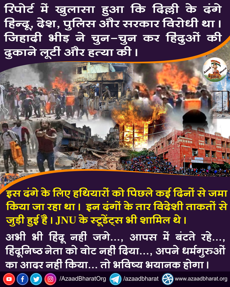 रिपोर्ट को जानकर आप समझ गए होंगे की किस तरीके से हिंदुओं को खत्म करने की साजिश चल रही है और ये भी देखा कि दिल्ली दंगों में अधिक नुकसान दलितों को हुई है फिर भी राष्ट्र विरोधी ताकतों द्वारा बिके कुछ लोग हिंदुओं को आपस मे जाति में बांट रहे हैं, भीम आर्मी बना रहे हैं। हिंदुओं को आपस में तोड़ने के लिए अनेक प्रयास किये जा रहे हैं। उनसे सावधान आपस में एक बने रहें।*
