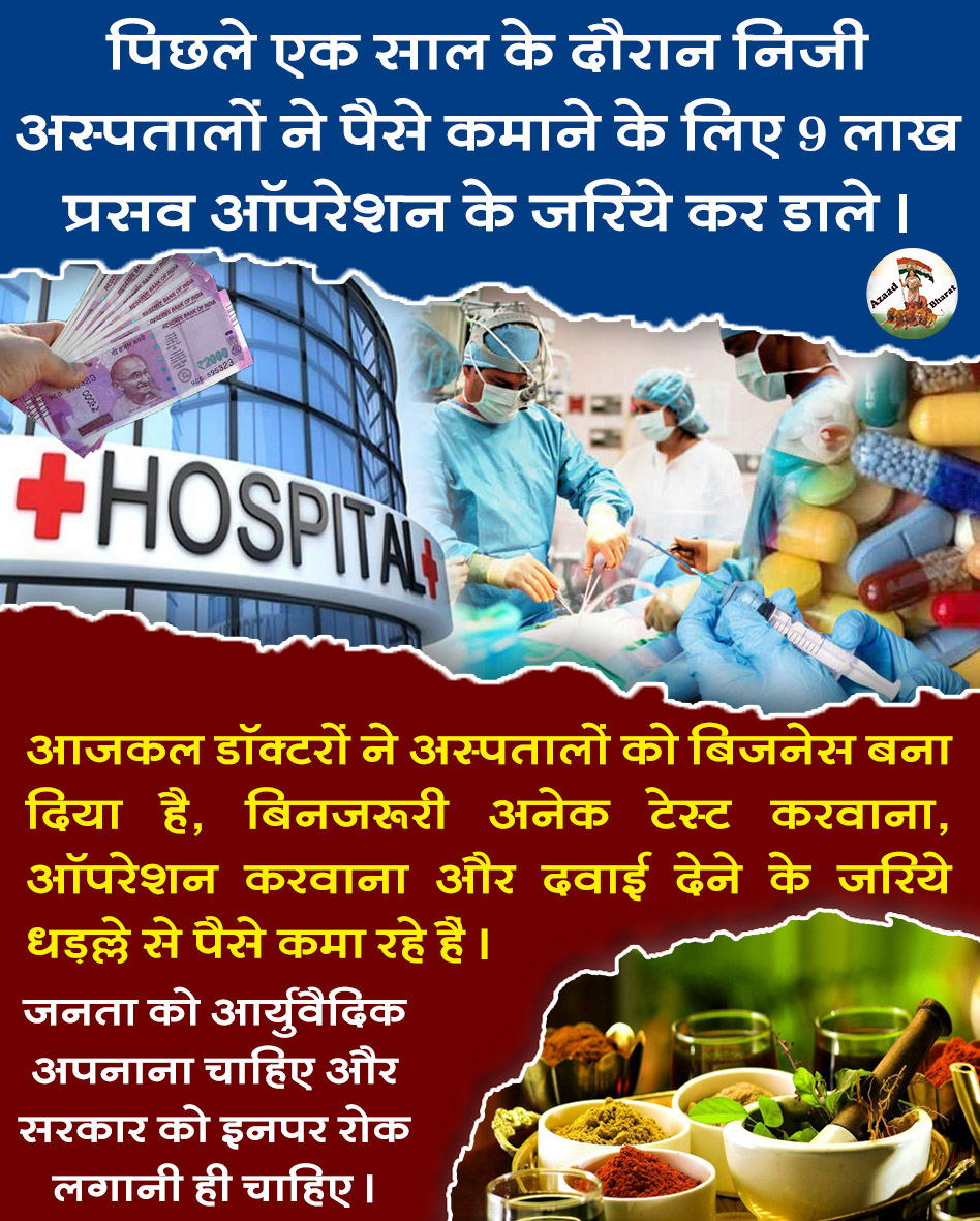एक ताजा रिपोर्ट ने देश के प्राइवेट अस्पतालों की पोल खोल कर रख दी है । अस्पतालों ने पैसे के लिए धड़ल्ले से नॉर्मल प्रसव को भी सिजेरियन सेक्शन (ऑपरेशन के जरिये) कर डाले । दरअसल, पिछले एक साल के दौरान निजी अस्पतालों में हुए 70 लाख प्रसवों में से 9 लाख प्रसव बगैर पूर्व योजना के सिजेरियन सेक्शन (सी-सेक्शन) के जरिए हुए, जिन्हें रोका जा सकता था और ये ऑपरेशन केवल पैसे कमाने के लिए किए गए ।