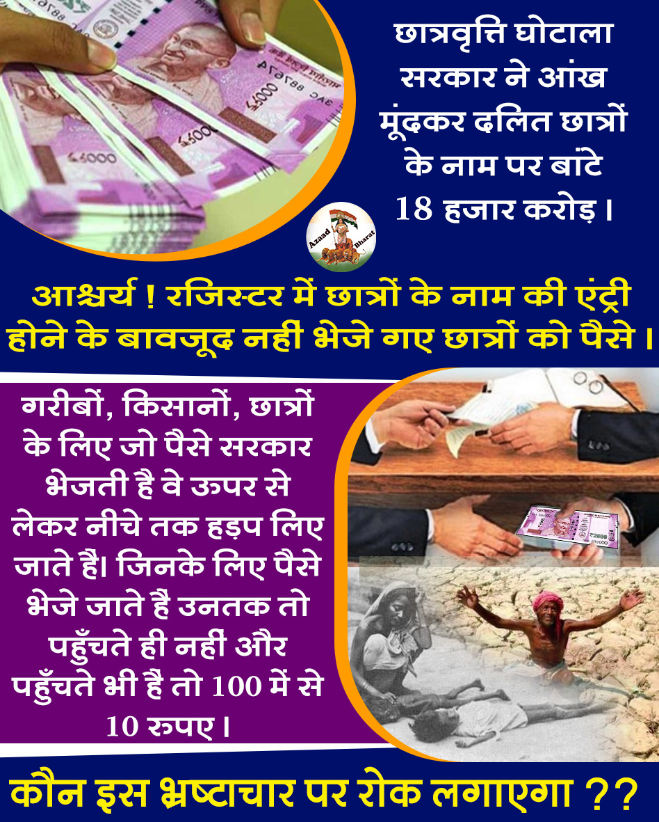 🚩अभी हाल ही में देश में अनुसूचित जाति के छात्रों की पोस्ट-मैट्रिक स्कॉलरशिप के नाम पर बड़े घोटाले का खुलासा हुआ है । उतर प्रदेश, महाराष्ट्र, पंजाब, तमिलनाडु और कर्नाटक में कैग की ऑडिट के दौरान इस खेल का खुलासा हुआ । पिछले पांच सालों में आंख मूंदकर इन राज्यों में, 18 हजार करोड़ रुपये से अधिक की छात्रवृत्ति बंटी | न नियमों का ख्याल किया गया, न उपभोग प्रमाणपत्र लिए गए, न ही किसी तरह की जांच हुई | चौंकानेवाली बात तो यह रही कि एक ही रोल नंबर, एक ही जाति प्रमाणपत्र पर हजारों छात्रों को धनराशि जारी कर दी गई | इससे सिस्टम में शिक्षा माफिया से लेकर अफसरों की भूमिका पर बड़े सवाल खड़े होते हैं | 187581 छात्रों के खाते में तो निर्धारित से 4967.19 लाख रुपए ज्यादा भेज दिए गए |
