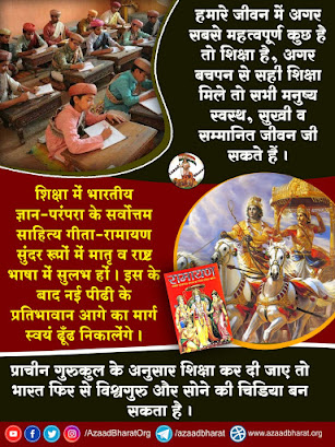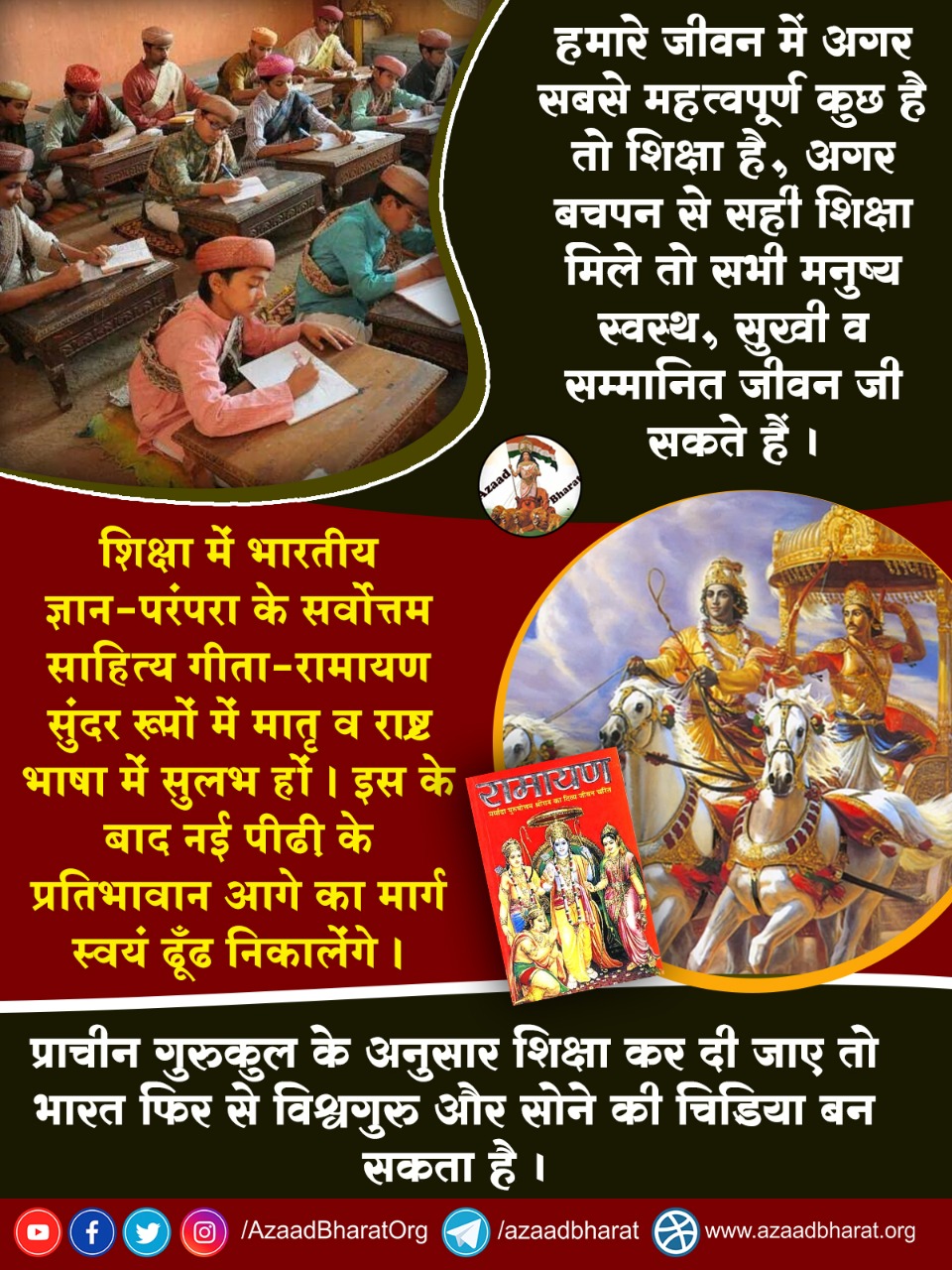 आजतक जितने भी देश उन्नत हुए वे अपनी भाषा में व अपना इतिहास पढ़कर ही हुए है। हमें भी हमारा प्राचीन इतिहास, मातृभाषा और राष्ट्रभाषा को महत्त्व देना चाहिए, 200 साल हमें गुलाम बनाने वाले अंग्रजो की भाषा को तो तुरंत हटा ही देना चाहिए ये मानसिकता की गुलामी है, अपने देश की संस्कृति, इतिहास , धर्म के बारे में बच्चों को सही जानकरी मिले उस अनुसार पाठ्यक्रम बनना चाहिए और प्राचीन गुरुकुलों के अनुसार शिक्षा नीति बननी चाहिए।