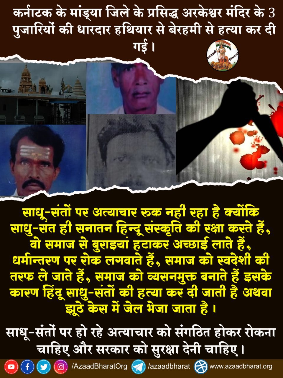 आपको बता दें कि कर्नाटक के मांड्या जिले के प्रसिद्ध अरकेश्वर मंदिर के 3 पुजारियों की गुरुवार (सितंबर 10, 2020) को बेरहमी से हत्या कर दी गई। वारदात को अंजाम उस समय दिया गया जब पुजारी मंदिर परिसर में सो रहे थे। पुजारियों को मौत के घाट उतारने के लिए धारदार हथियार के अलावा पत्थर का इस्तेमाल किया गया। बताया जा रहा है कि ये काम चोरी करने वाली गैंग का है।