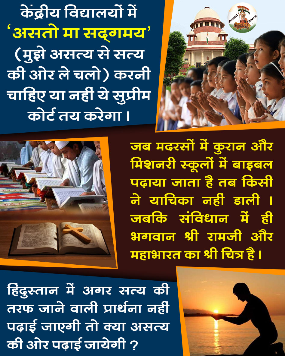 ईसाइयों के कॉन्वेंट स्कूलों में जो उनकी की प्रार्थना करवाई जाती है उसपर उन्हें कोई आपत्ति नहीं है, मदरसों में कुरान पढ़ाई जाती है उसपर उनको कोई आपत्ति नही है। बस हिन्दू धर्म को नष्ट करने के सपने देखते रहते हैं ।*