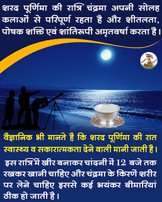 आश्विन मास के शुक्ल पक्ष की पूर्णिमा को ‘शरद पूर्णिमा’ बोलते हैं । शरद पूर्णिमा की रात्रि पर चंद्रमा पृथ्वी के सबसे निकट होता है और अपनी सोलह कलाओं से परिपूर्ण रहता है। इस रात्रि में चंद्रमा का ओज सबसे तेजवान और ऊर्जावान होता है। पृथ्वी पर शीतलता, पोषक शक्ति एवं शांतिरूपी अमृतवर्षा करता है । इस साल 30 अक्टूबर की रात में खीर बनाकर खानी है व 31 अक्टूबर को व्रत-पूजन करना है।