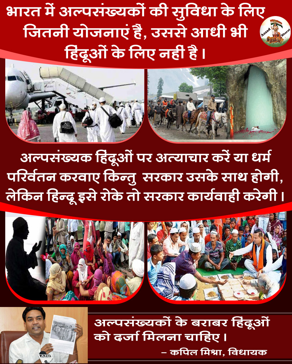 विधायक कपिल मिश्रा ने पहली मांग रखी है कि हिंदुओं के स्तर को बढ़ा कर अल्पसंख्यक को के बराबर किया जाए । ” equal right for hindus in india” हिंदुओं को भी समान अधिकार दो ये पहली मांगे है । हमें भेदभाव न रखो जैसे गोरे और काले का भेदभाव अफ्रीका में किया जाता था । गोरे बहुत कम थे काले ज्यादा थे उसके बावजूद भी गोरों को कुछ विशेष अधिकार प्राप्त थे । उनको जो अल्पसंख्यक अधिकार प्राप्त थे वो बाहर का समाज को नहीं थे । ऐसी स्थिति भारत में आ चुकी है बहुसंख्यक हिंदू के अधिकार बहुत कम है । अल्पसंख्यक समाज के सामने । तो हमारी पहली मांग है बहुत सिंपल मांग है बराबरी की मांग equality (समानता) की मांग ।