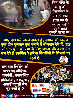 चोर तबरेज अंसारी की पिटाई कर दी जाए या किसी गौ तस्कर पहलू खान को चार लठ मार दिए जाए तब सारी वामपंथी मीडिया व बॉलीवुड के कुछ कुतर्की बिलबिलाने लगते हैं लेकिन साधु की पीट पीटकर हत्या कर दी फिर भी ये सब चुप हैं।