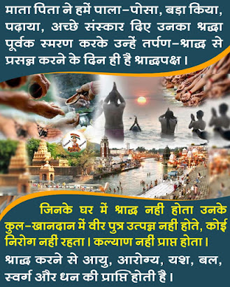 मरणोत्तर क्रियाओं-संस्कारों का वर्णन हमारे शास्त्र-पुराणों में आता है । आश्विन (गुजरात-महाराष्ट्र के मुताबिक भाद्रपद) के कृष्ण पक्ष को हमारे हिन्दू धर्म में श्राद्ध पक्ष के रूप में मनाया जाता है। श्राद्ध की महिमा एवं विधि का वर्णन विष्णु, वायु, वराह, मत्स्य आदि पुराणों एवं महाभारत, मनुस्मृति आदि शास्त्रों में यथास्थान किया गया है । इस वर्ष श्राद्ध पक्ष : 01 सितम्बर से 17 सितंबर तक है।