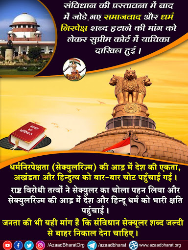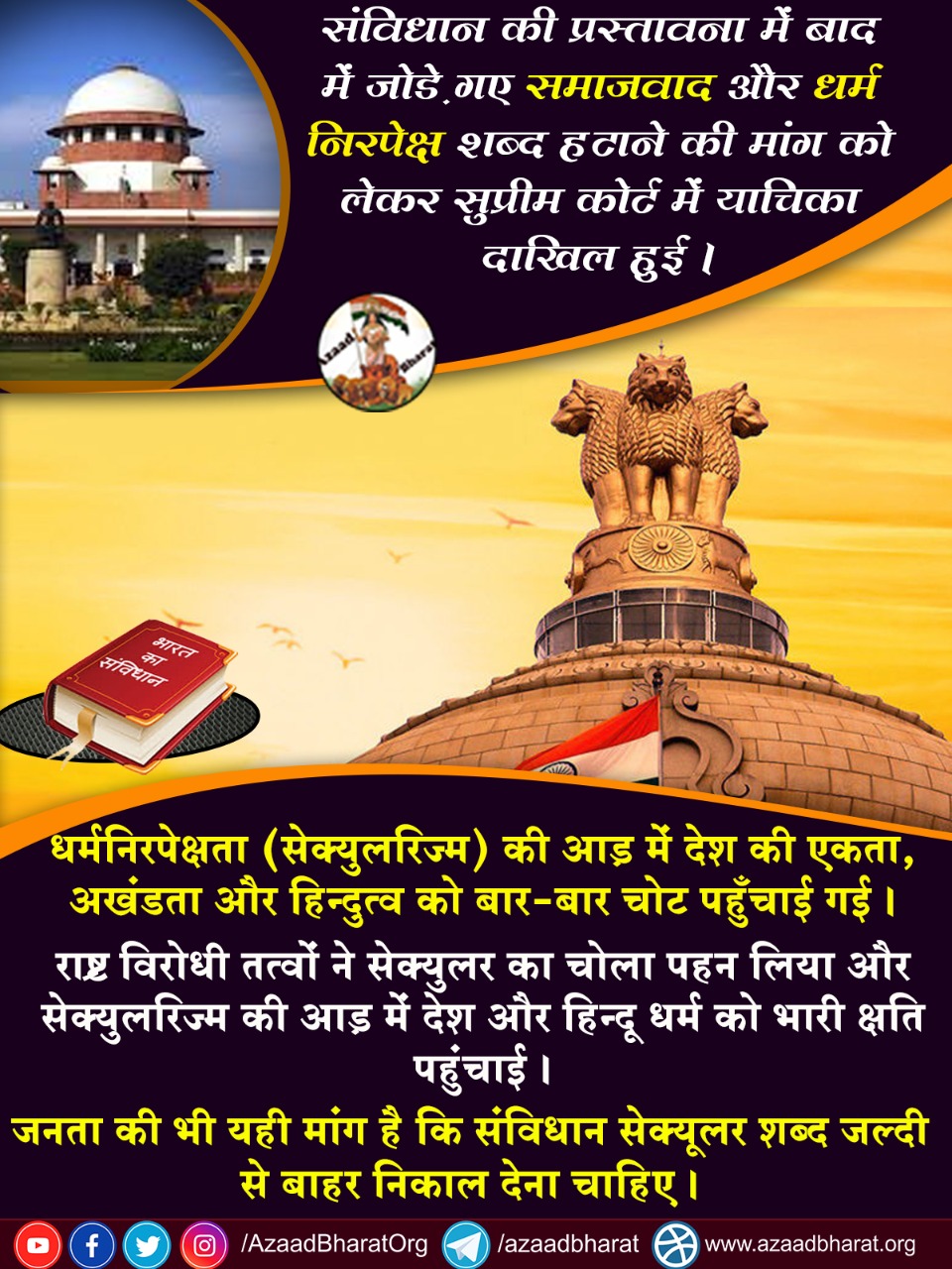 ये हर्ष का विषय है कि ऐसी याचिका आज सर्वोच्च न्यायालय में दाखिल हुई है जिसमें दशकों के भेदभाव और अन्याय के खिलाफ आवाज़ उठाई गई है। सभी देशवासियों से अपील है कि एक आवाज़ से संविधान की प्रस्तावना से “समाजवाद” और “धर्मनिरपेक्ष” शब्द हटाने वाली इस याचिका का समर्थन करें ताकि इन शब्दों की आड़ में देश की एकता, अखंडता और हिन्दुत्व पर प्रहार करने वाले राष्ट्र विरोधी तत्वों से देश और हिन्दुत्व की रक्षा हो।