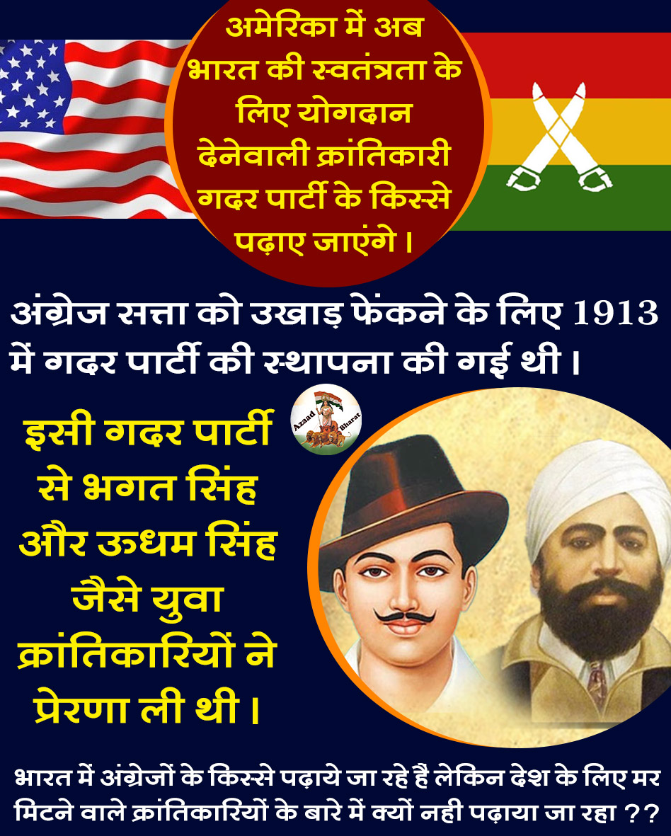 भारत के इतिहास में आज भी लुटेरे अंग्रेजों के किस्से पढाये जाते है और उनकी महिमा मंडन की जा रही है लेकिन जिन क्रांतिकारीयों ने देश की स्वतंत्रता के लिए अपने प्राणों की बलि दे दी उनके किस्से हमे नही पढाये जा रहे है ये बड़े दुर्भाग्यपूर्ण बात है लेकिन अमेरिका में यह निर्णय लिया गया है कि भारत की स्वतंत्रता के लिए योगदान देनेवाली क्रांतिकारी गदर पार्टी के किस्से पढाए जाएंगे ।