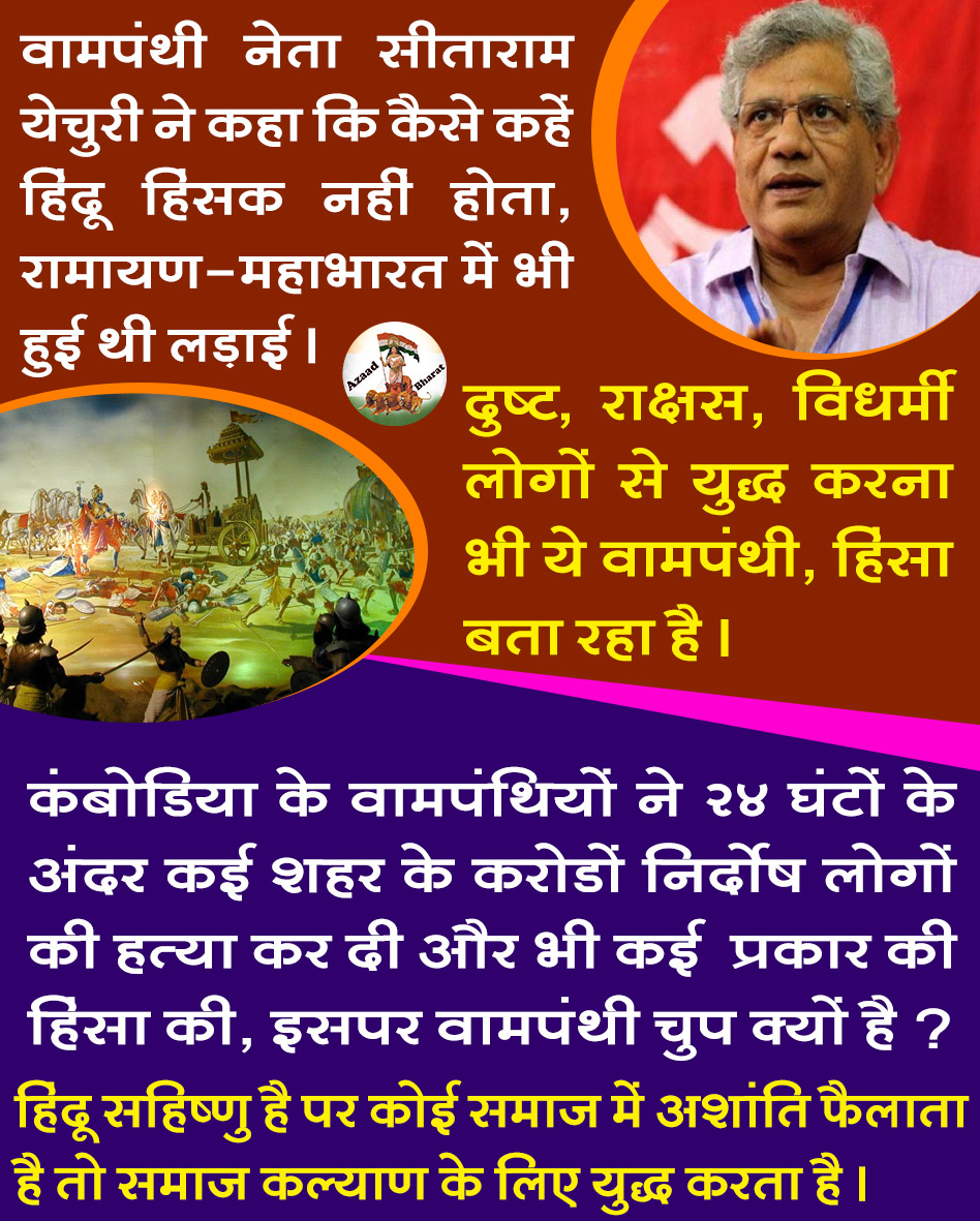 वामपंथी नेता सीताराम येचुरी ने भोपाल में 3 मई को बताया कि हिंदू हिंसक है क्योंकि रामायण और महाभारत भी हिंसा और लड़ाई के उदाहरणों से भरे हैं । जबकि वास्तविकता यह है कि हिन्दू ने सामने से कभी भी हिंसा नहीं की है जब दुष्ट लोग बढ़ जाते हैं और समाज को प्रताड़ित करते हैं तब समाज मे शांति लाने के लिए युद्ध करके दृष्ट लोगों का संहार करते हैं, वे केवल समाज कल्याण के लिए करते हैं पर वामपंथी हमेशा हिदुओं पर ही प्रश्न खड़ा करते हैं पर आज उनकी वास्तविकता बताते हैं ।