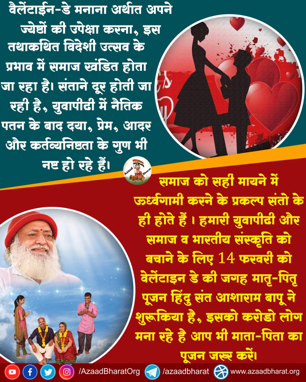 वैलेंटाइन डे से युवाओं का अत्यधिक पतन हो रहा है इसलिए अब तो ऐसा समय आ गया है कि वैलेंटाइन डे की जगह लोगों ने अभी से 14 फरवरी के दिन “मातृ-पितृ पूजन दिवस” निमित्त मातृ-पितृ पूजन कार्यक्रम शुरू कर दिया है ।