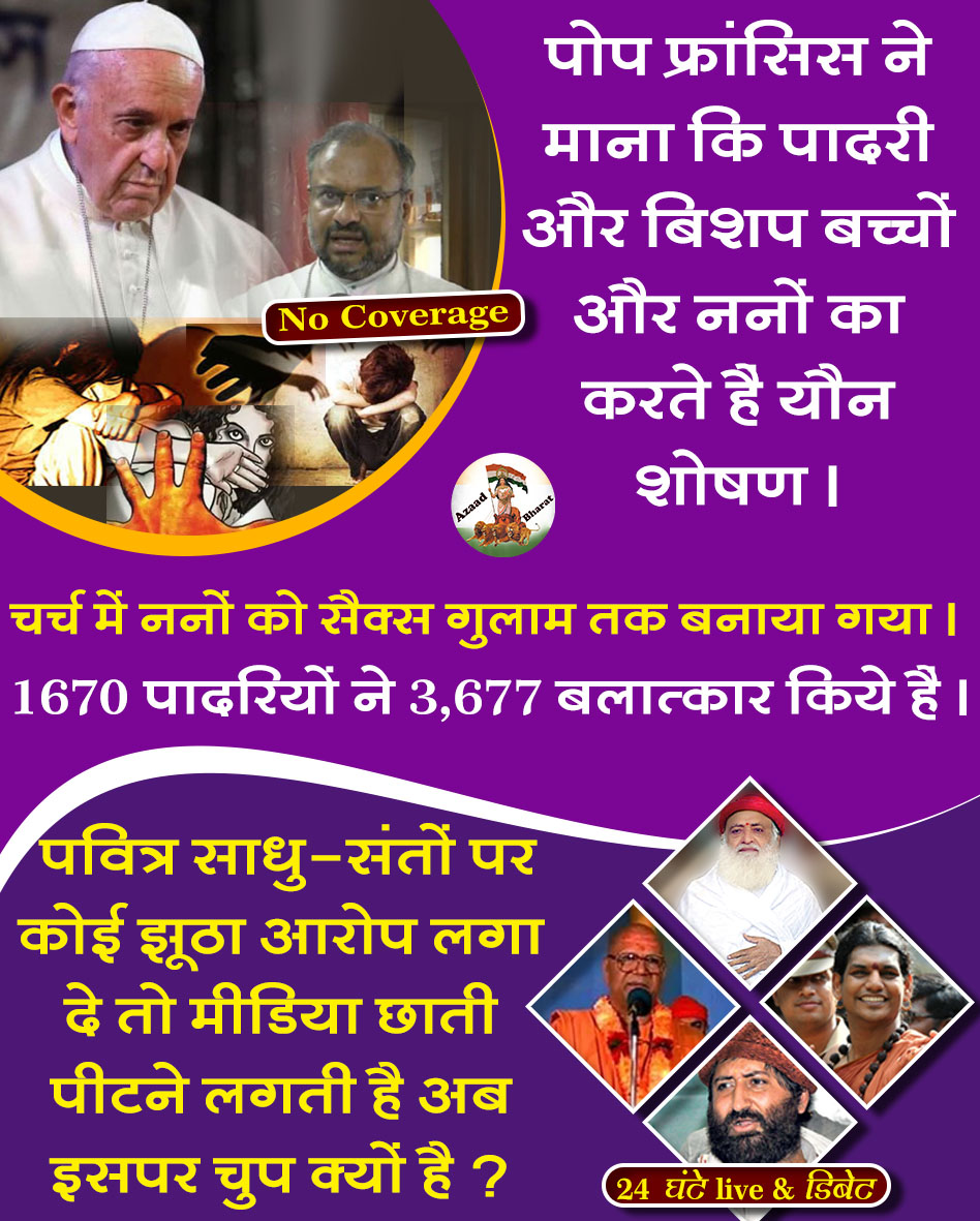 ईसाई पादरी बच्चों और ननों का यौन शोषण करते हैं पर इसपर किसी भी बुध्दिजीवी, सेकुलर, वामपंथी, मीडिया नजर नहीं जा रही है । इनकी नजर बस पवित्र हिंदू साधु-संतों की तरफ ही होती है, किसी संत पर झूठा आरोप भी लग जाये तो दुनियाभर में हल्ला करते हैं, बढ़ा-चढ़ा कर ख़बरें दिखाते हैं, पर हजारों पादरी यौन शोषण कर रहे हैं, उनके खिलाफ चुप हैं । इससे सिद्ध होता है कि इनमें मानवीय संवेदना नहीं है बस टीआरपी और पैसे की भूख है, हिंदुस्तानी ऐसी मीडिया और बलात्कारी पादरियों से सावधान रहें ।