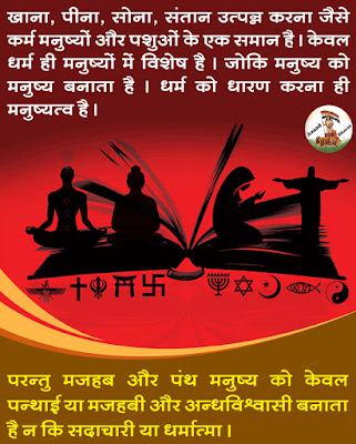 *6. धर्म ही मनुष्य को मनुष्य बनाता है अथवा धर्म अर्थात धार्मिक गुणों और कर्मों के धारण करने से ही मनुष्य मनुष्यत्व को प्राप्त करके मनुष्य कहलाने का अधिकारी बनता है। दूसरे शब्दों में धर्म और मनुष्यत्व पर्याय है। क्यूंकि धर्म को धारण करना ही मनुष्यत्व है। कहा भी गया है- खाना,पीना,सोना,संतान उत्पन्न करना जैसे कर्म मनुष्यों और पशुओं के एक समान है। केवल धर्म ही मनुष्यों में विशेष है। जोकि मनुष्य को मनुष्य बनाता है। धर्म से हीन मनुष्य पशु के समान है। परन्तु मज़हब मनुष्य को केवल पन्थाई या मज़हबी और अन्धविश्वासी बनाता है। दूसरे शब्दों में मज़हब अथवा पंथ पर ईमान लेन से मनुष्य उस मज़हब का अनुनायी अथवा ईसाई अथवा मुस्लमान बनता है।  नाकि सदाचारी या धर्मात्मा बनता है।*