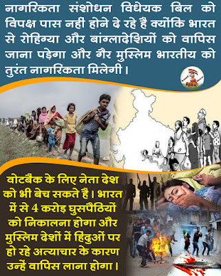 विपक्ष एक बार फिर राज्यसभा में सरकार के सामने तनकर खड़ा हो गया तथा विपक्ष ने नागरिकता संशोधन विधेयक को पास होने से रोक दिया । अब यह विधेयक अगले सत्र में पेश किया जा सकता है । इस बिल के पास होने के बाद पाकिस्तान, बांग्लादेश, अफगानिस्तान से पीड़ित होकर भारत आने वाले गैर मुस्लिम(हिन्दू, सिख, ईसाई, जैन, बौद्ध, पारसी) हिंदुस्तान की नागरिकता प्राप्त कर सकेंगे तथा इस बिल के मुताबिक बांग्लादेशी घुसपैठिए को देश छोड़कर जाना होगा, लेकिन मजहबी कट्टरपंथी तथा तथाकथित सेक्यूलर दल इस बिल के खिलाफ है । ये जानने के बाद भी कि बांग्लादेशी घुसपैठिये देश की सुरक्षा के लिए बड़ा खतरा बन चुके हैं, देश को खोखला कर रहे हैं, इतना होने पर भी विपक्ष राजनीति से बाज नहीं आ रहा है ।