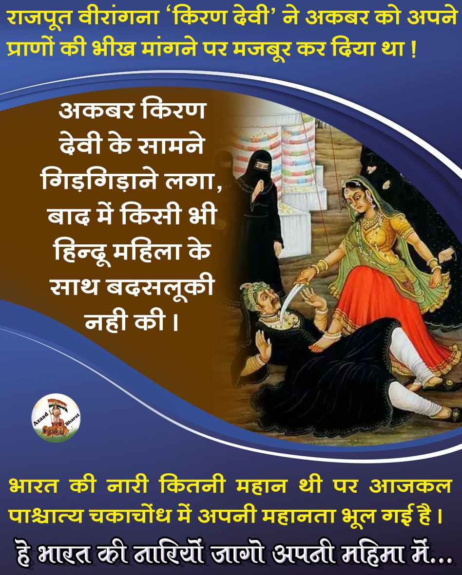 🚩राजपूत पुरुष जीतनी अपनी वीरता के लिए प्रसिद्ध थे उतनी ही प्रसिद्ध थी राजपूती महिलायें। इतिहास में अनेक ऐसी कहानियां है जो इनकी वीरता व अदम्य साहस को प्रमाणित करती है। आज हम आपको एक ऐसी ही ऐतिहासिक कहानी बताएँगे जब एक राजपूत वीरांगना ‘किरण देवी’ ने अकबर को अपने प्राणों कि भीख मांगने पर मजबूर कर दिया था !