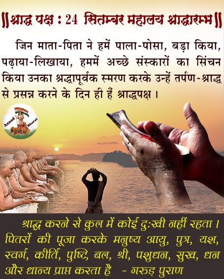 #मरणोत्तर क्रियाओं-संस्कारों का वर्णन हमारे #शास्त्र-पुराणों में आता है । #आश्विन(गुजरात-महाराष्ट्र के मुताबिक भाद्रपद) के कृष्ण पक्ष को हमारे #हिन्दू धर्म में श्राद्ध पक्ष के रूप में मनाया जाता है । श्राद्ध की महिमा एवं विधि का वर्णन विष्णु, वायु, वराह, मत्स्य आदि पुराणों एवं महाभारत, मनुस्मृति आदि शास्त्रों में यथास्थान किया गया है ।